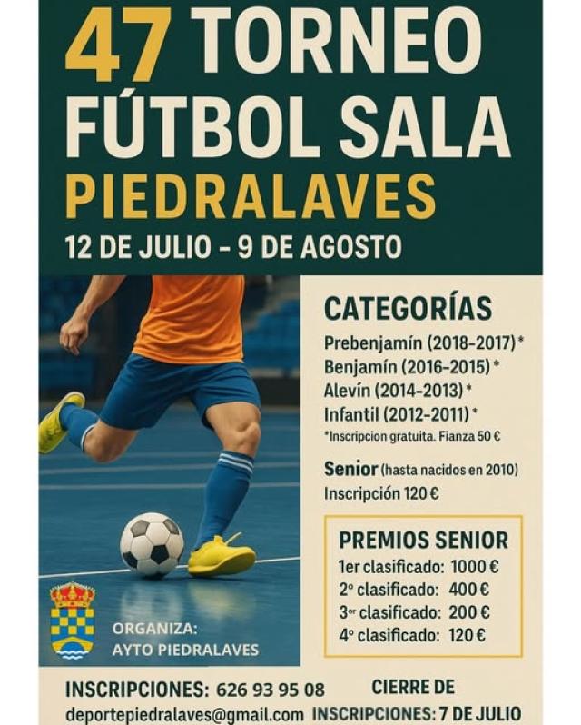 Un año más el Ayuntamiento de Piedralaves organiza el Torneo de Futbol Sala, en su edición 47, que se celebrará del 12 de julio al 9 de agosto.