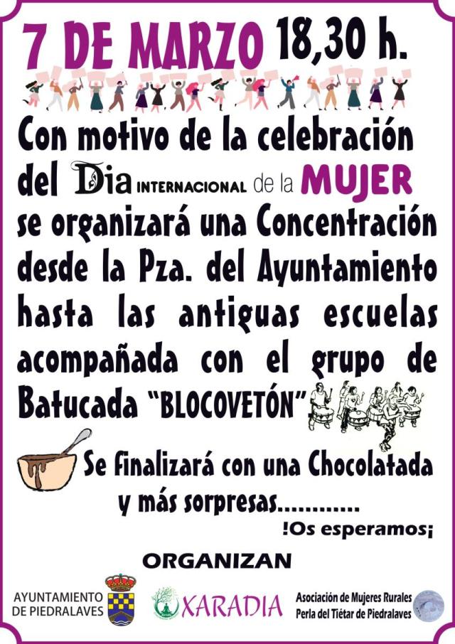 Con motivo de la celebración del Día Internacional de la Mujer (el sábado 8 de marzo), el Ayuntamiento de Piedralaves, junto con la Asociación Xaradia y la Asociación de Mujeres Rurales “Perla del Tiétar” de Piedralaves organizan una concentración en la Plaza de la Constitución a las 18:30 horas del viernes, 7 de marzo.