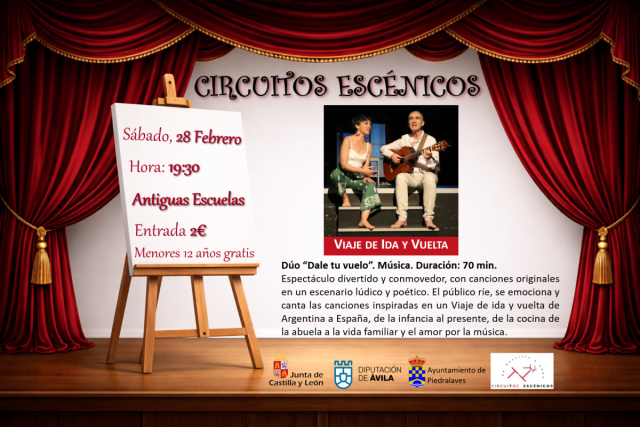 El próximo sábado, 28 de febrero a las 19:30 horas contaremos con un nuevo espectáculo incluido en la programación de Circuitos Escénicos de Castilla y León 2026, en la sala multiusos de las Antiguas Escuelas.