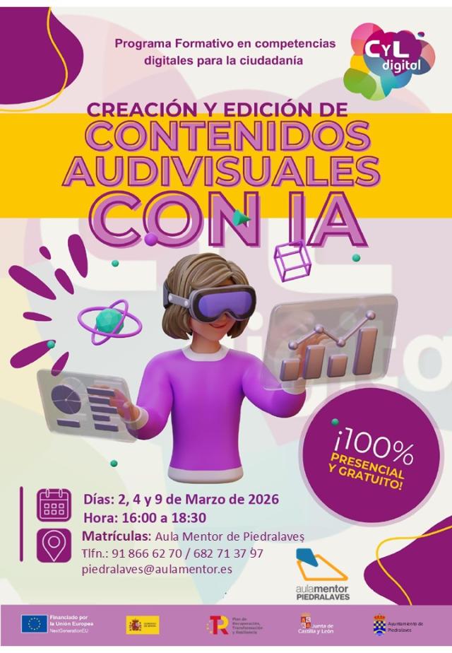 El Aula Mentor de Piedralaves junto con CyLDigital, ofrece un nuevo taller presencial y gratuito sobre Inteligencia Artificial: “CREACIÓN Y EDICIÓN DE CONTENIDOS AUDIOVISUALES CON IA”, los días 2, 4 y 9 de marzo de 16:00 a 18:30 horas.