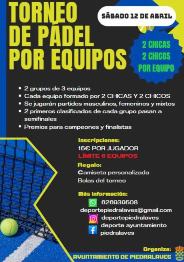 El próximo 12 de Abril, tendrá lugar el Primer Torneo de Pádel por Equipos de Piedralaves, organizado por el Ayuntamiento.